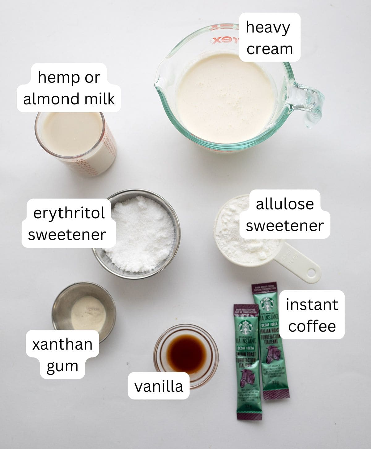 - Low carb milk: I use nut milk like almond or macadamia. But any low carb milk works here, including coconut milk or hemp milk.